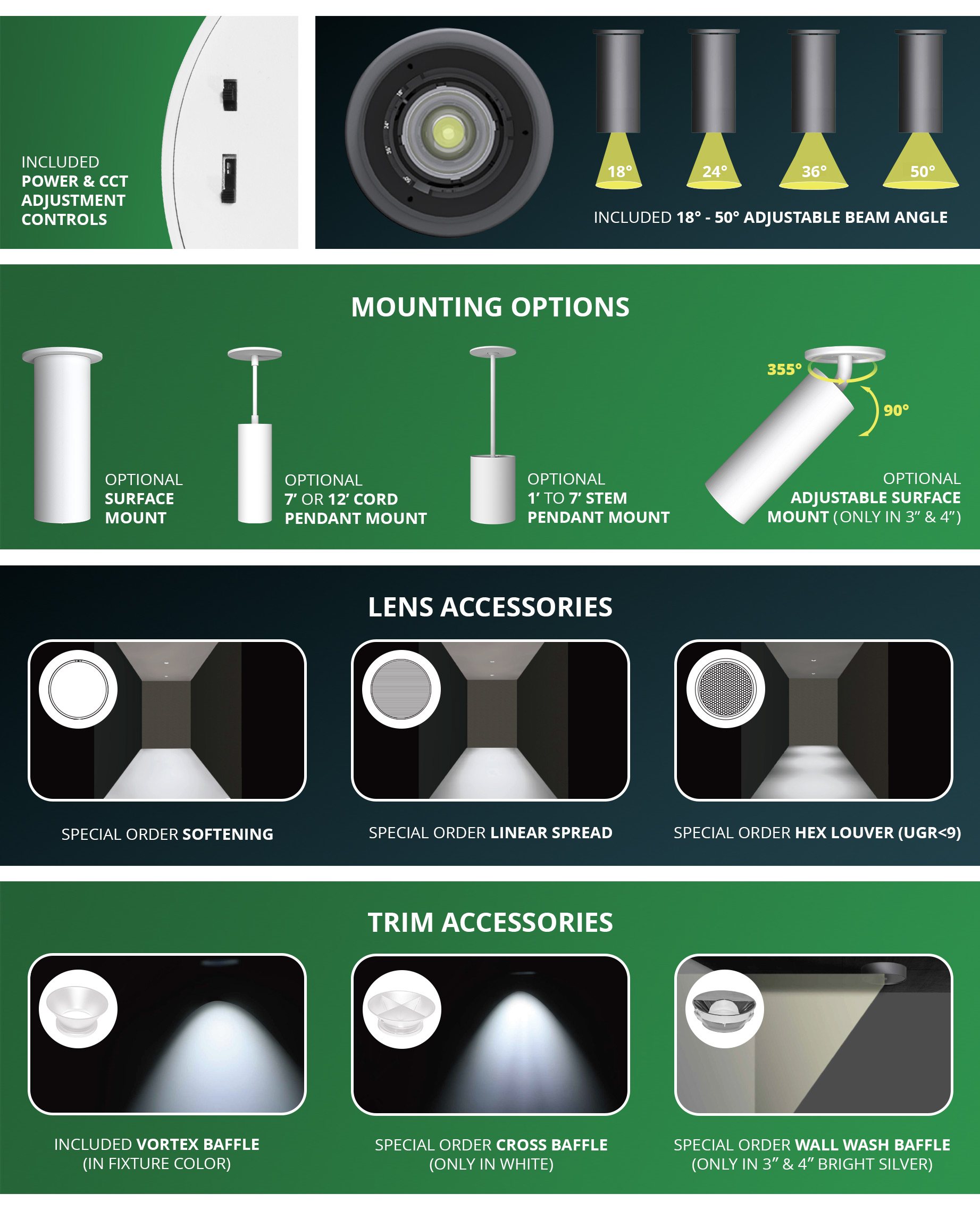 Available in 3″, 4″ and 6″ sizes, the Series GKOARCHG2 Architectural Cylinder Light is a Power & CCT Selectable decorative interior LED fixture with continuous beam angle adjustment from 18° to 50°. A range of field-interchangeable mounting options and lens and trim accessories are available, and the fixture may be disassembled for application of custom RAL finishes to coordinate with existing decor.