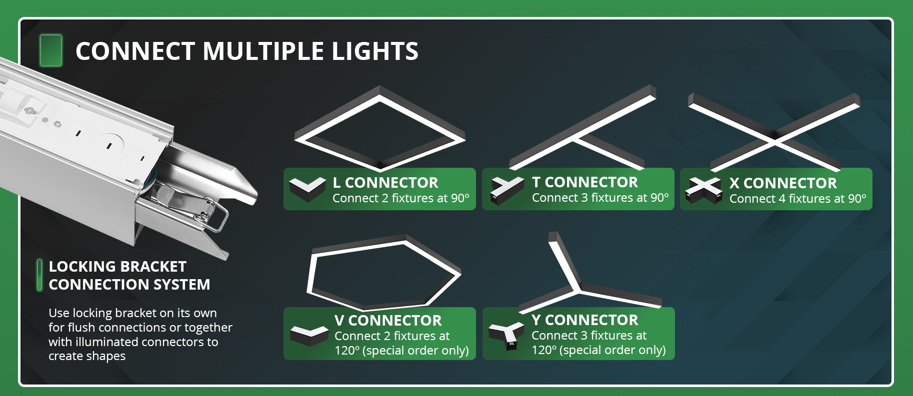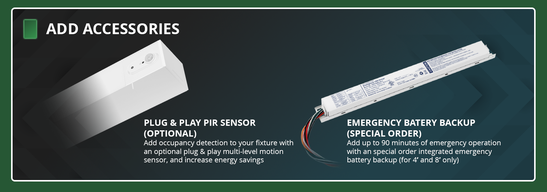 Available in standard 2ft, 4ft, and 8ft sizes, series GKOARLG1 Architectural Linear Lights are a modular interior lighting solution for commercial and institutional environments. Power, CCT, and Up/Downlight Adjustment Controls are standard on all models, and a wide range of connection and mounting options allow for an endless variety of lighting configurations.