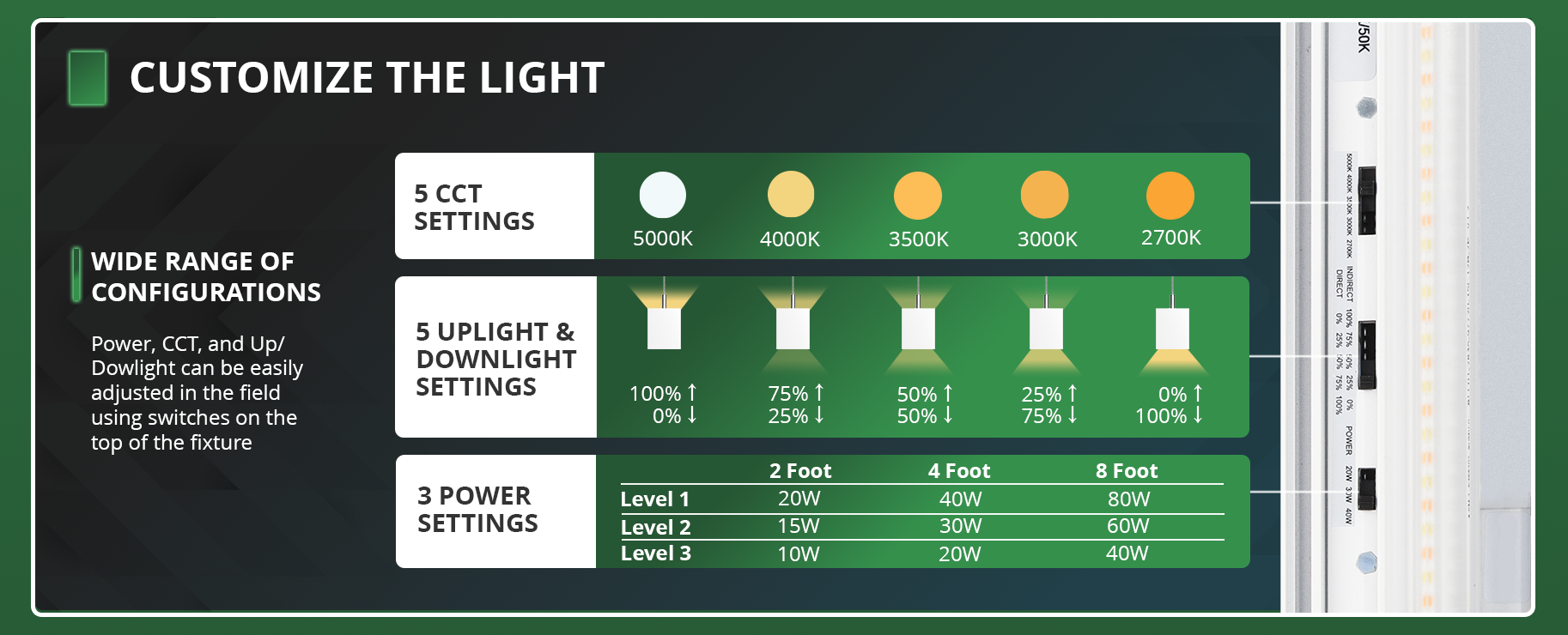 POWER, CCT, UP/DOWNLIGHT SELECTABLE 3 Power, 5 CCT, and 5 Up/Downlight Settings